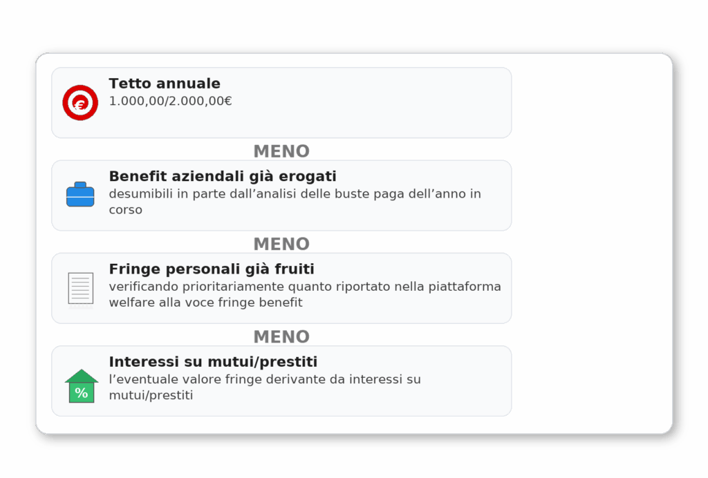 Valuta alternative non-Fringe (se presenti in piattaforma) che non consumano il tetto: es. previdenza complementare, rimborsi per istruzione/infanzia, abbonamenti TPL, rimborso spese sanitarie.
