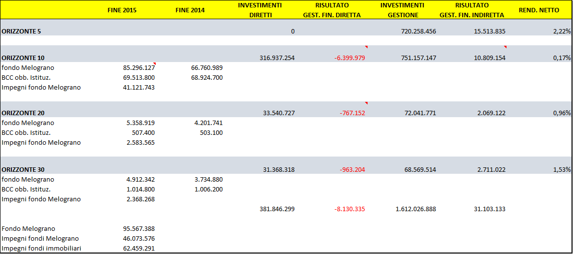 Dal bilancio 2015 si evidenziano, infatti, che le quote sottoscritte del Fondo Melograno ammontano a 95 milioni ed anche impegni di sottoscrizione per ulteriori 45 milioni, cioè somme ancora da versare al Fondo Melograno, per gli investimenti fatti e anche per estinzione di operazioni creditizie.