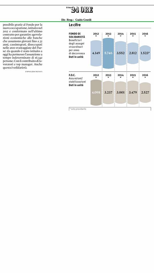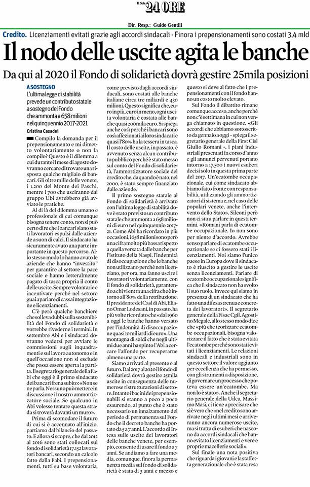 … Il segretario generale della Fisac Cgil, Agostino Megale, allo stesso modo dice che «più che teorizzare ecatombe occupazionali, bisogna valorizzare il fatto che è stata evitata l’ecatombe perché sono stati evitati i licenziamenti. Le relazioni sindacali e industriali sono in questo settore il valore aggiunto per eccellenza che ha permesso, con gli strumenti a disposizione, di governare un processo che poteva essere un’ecatombe. Ma non lo è stato».